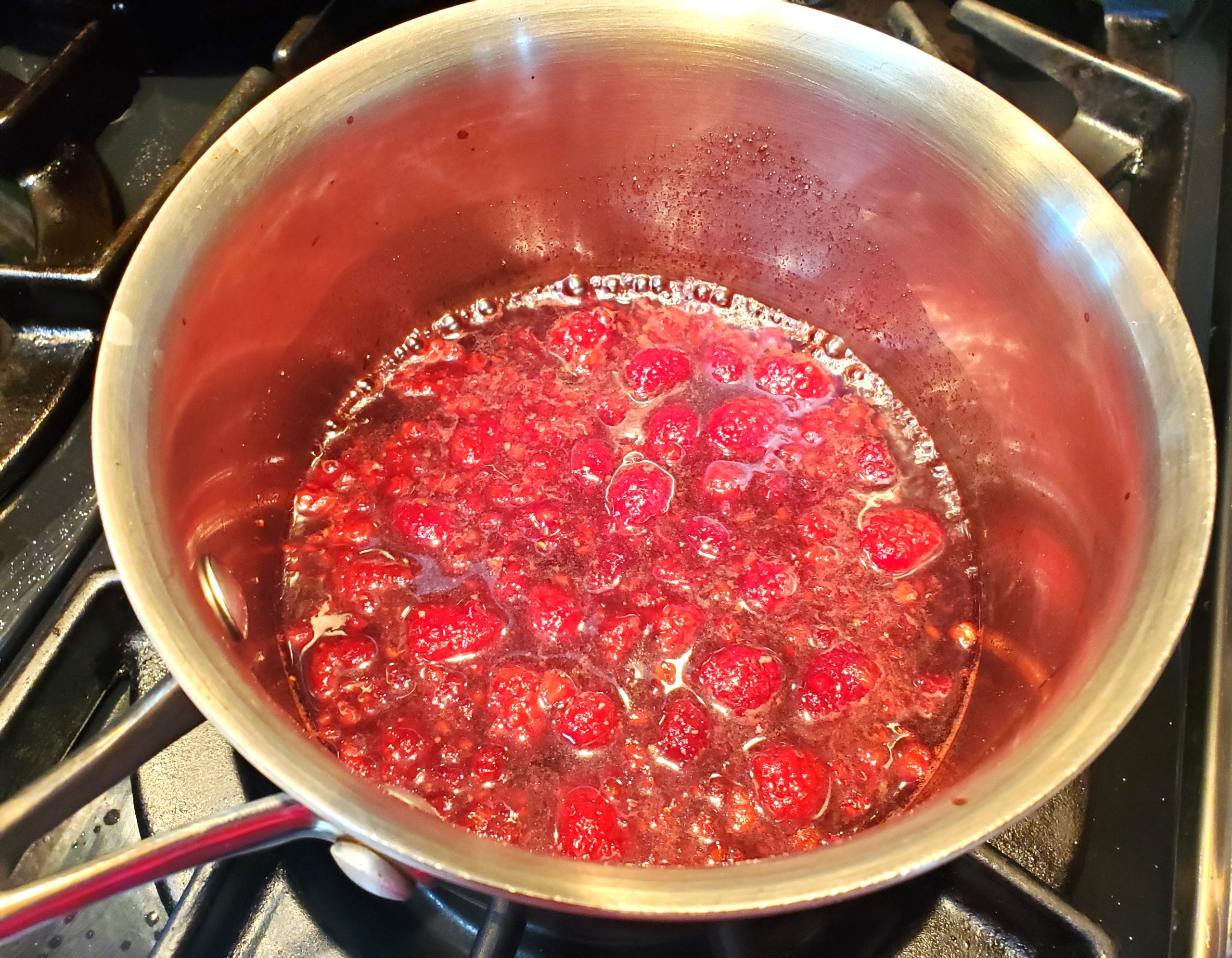 - Remove from heat. Let cool slightly and pour through a fine mesh seize. Using the back of a spoon push the raspberry through the seize to capture all the juices, but no seeds. If making a day ahead, cover and place in the fridge overnight.