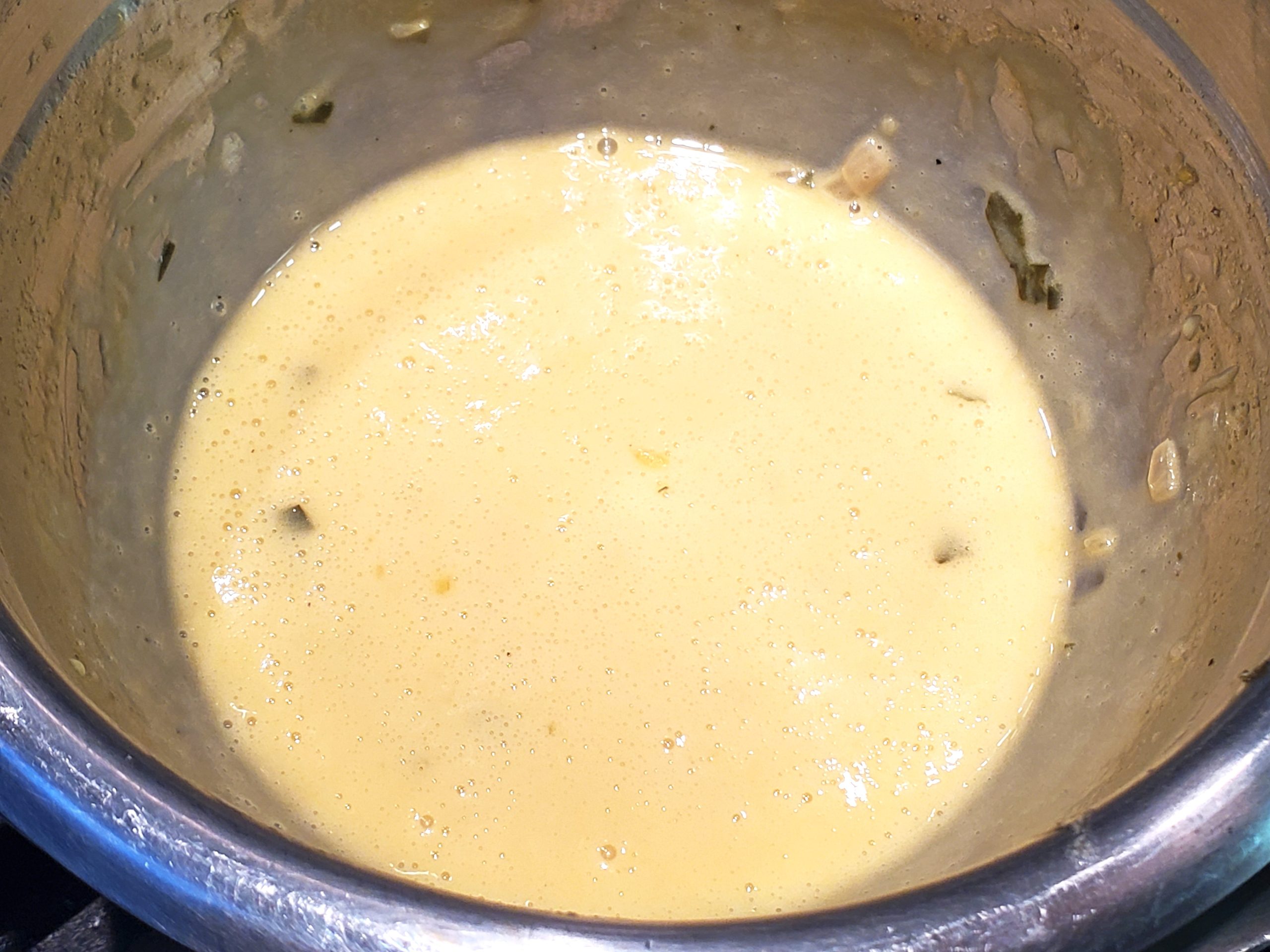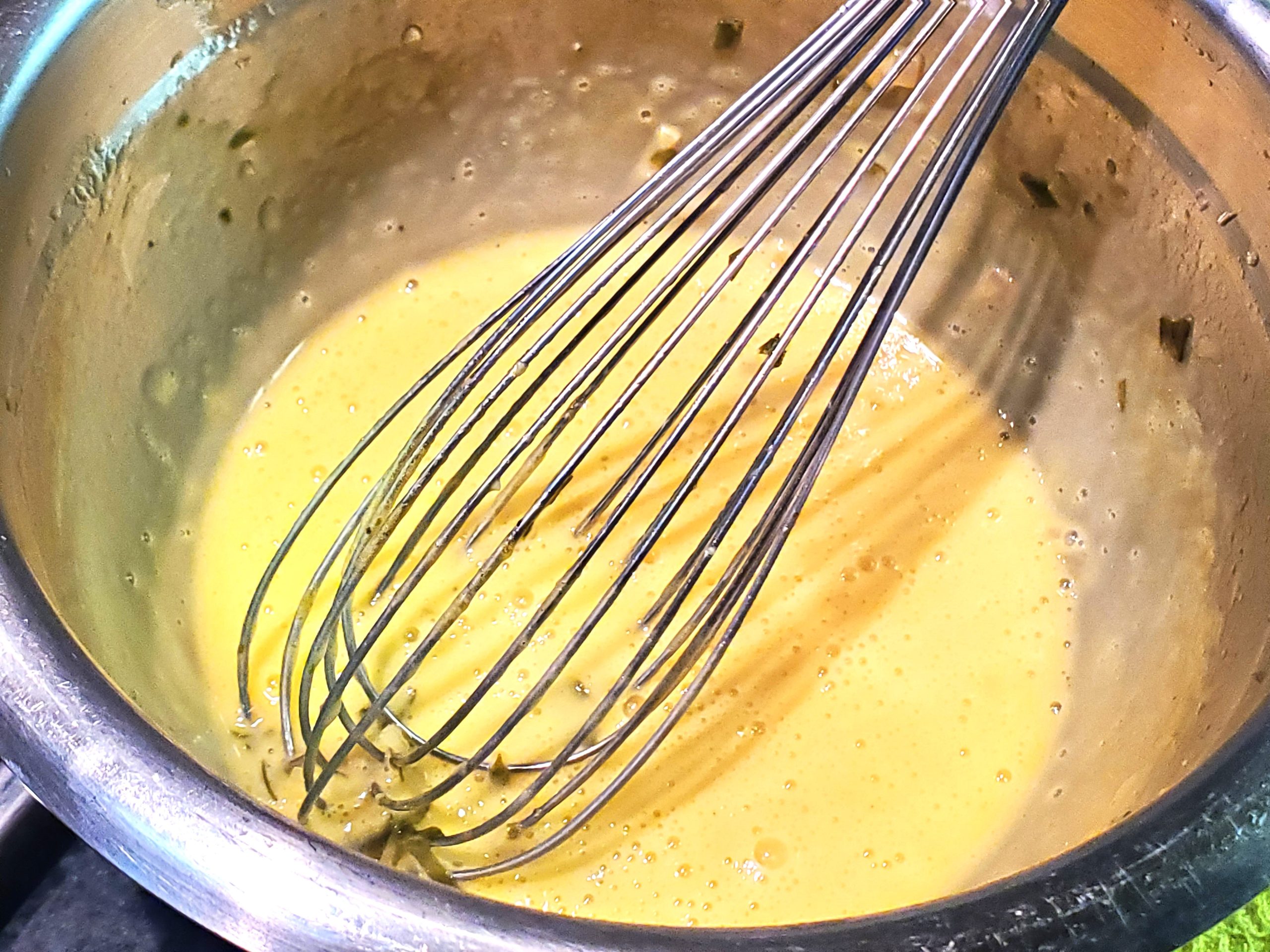 Once the eggs have doubled in volume, slowly add in the melted butter, beating continuously until the sauce has thickened.