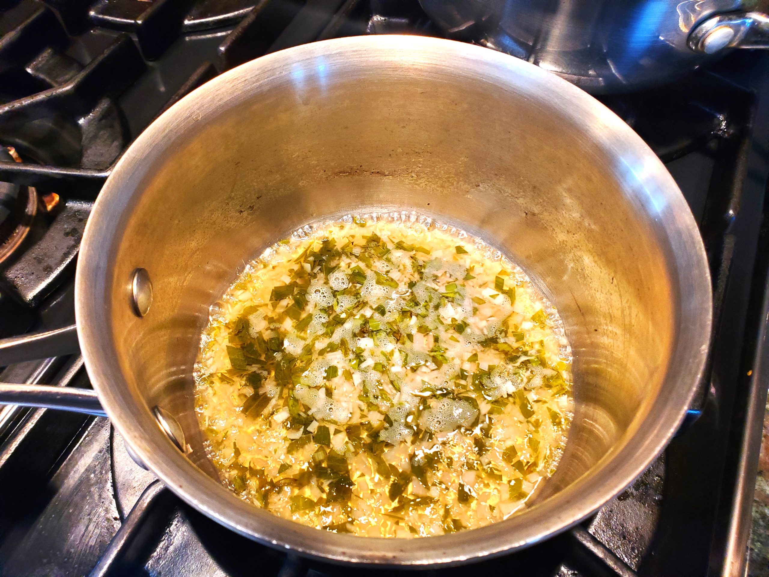 In a small saucepan, combine tarragon, shallots, white wine vinegar (Tyler uses champagne vinegar, but I didn’t have any and this works very well) and wine over medium-high heat. Bring to a simmer and cook until reduced by half; about 10-12 minutes. Remove from the heat and set aside.