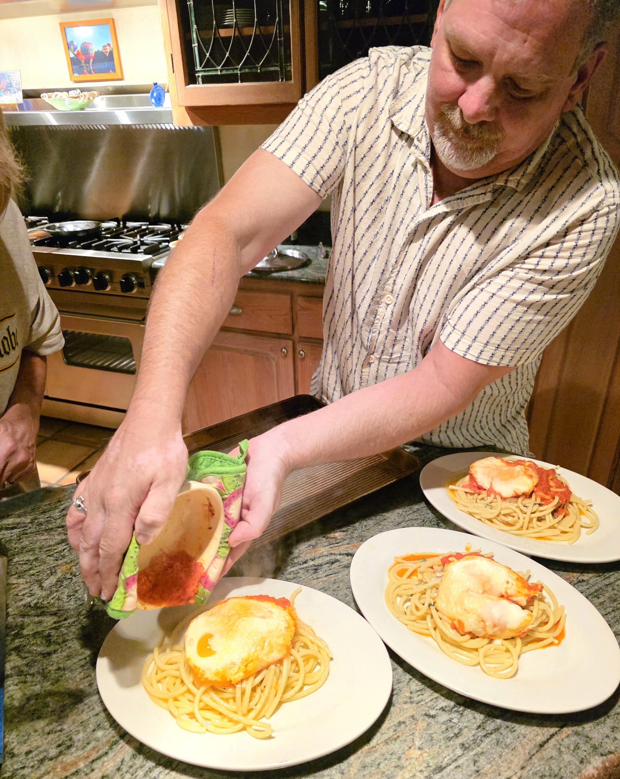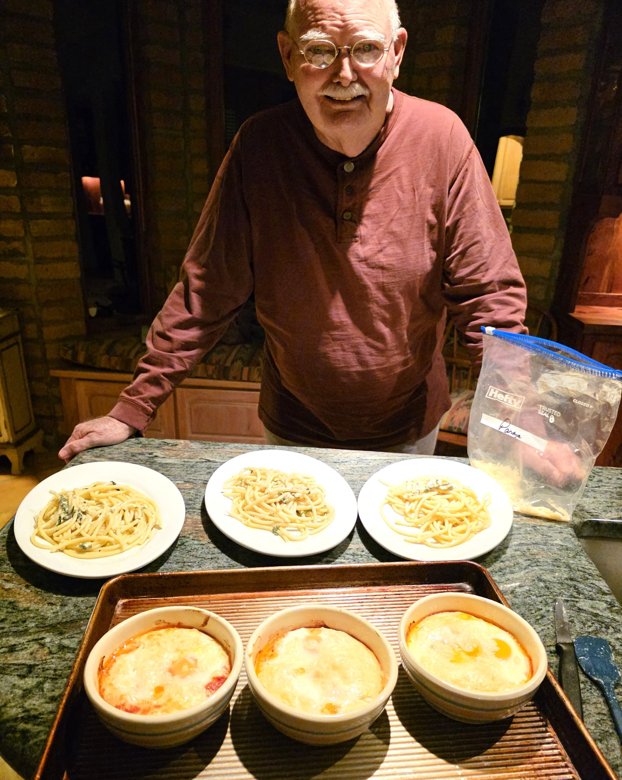 This delicious, ancient Italian dish of eggs baked in rich tomato sauce is good for breakfast, brunch, lunch or dinner! I made it when our son, Mike was recently in town and served it for dinner over bucatini pasta.