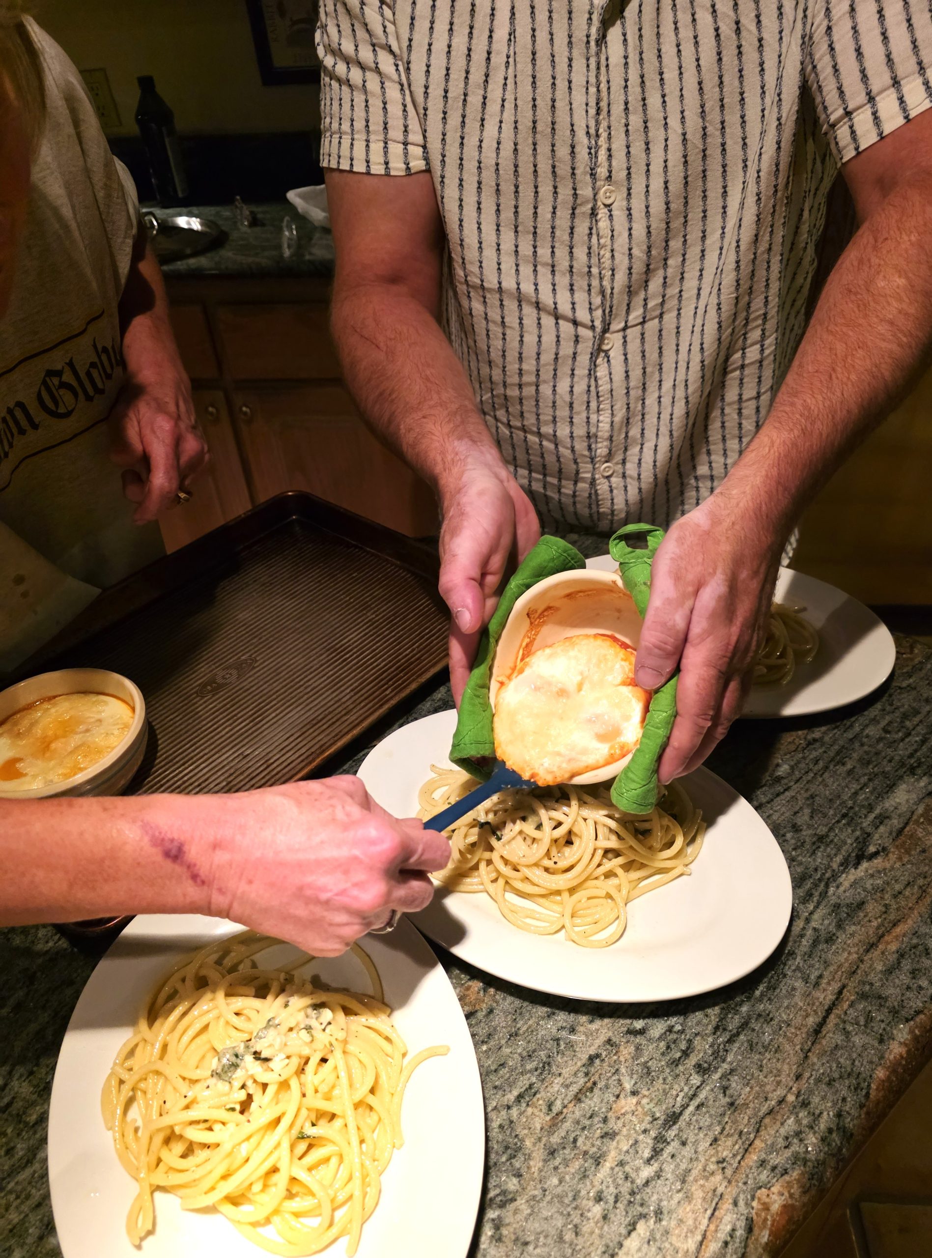 Once the whites of the eggs are “set” carefully remove from the bowls and lay over the pasta. Serve piping hot. I served with a small green salad and some crusty garlic bread.