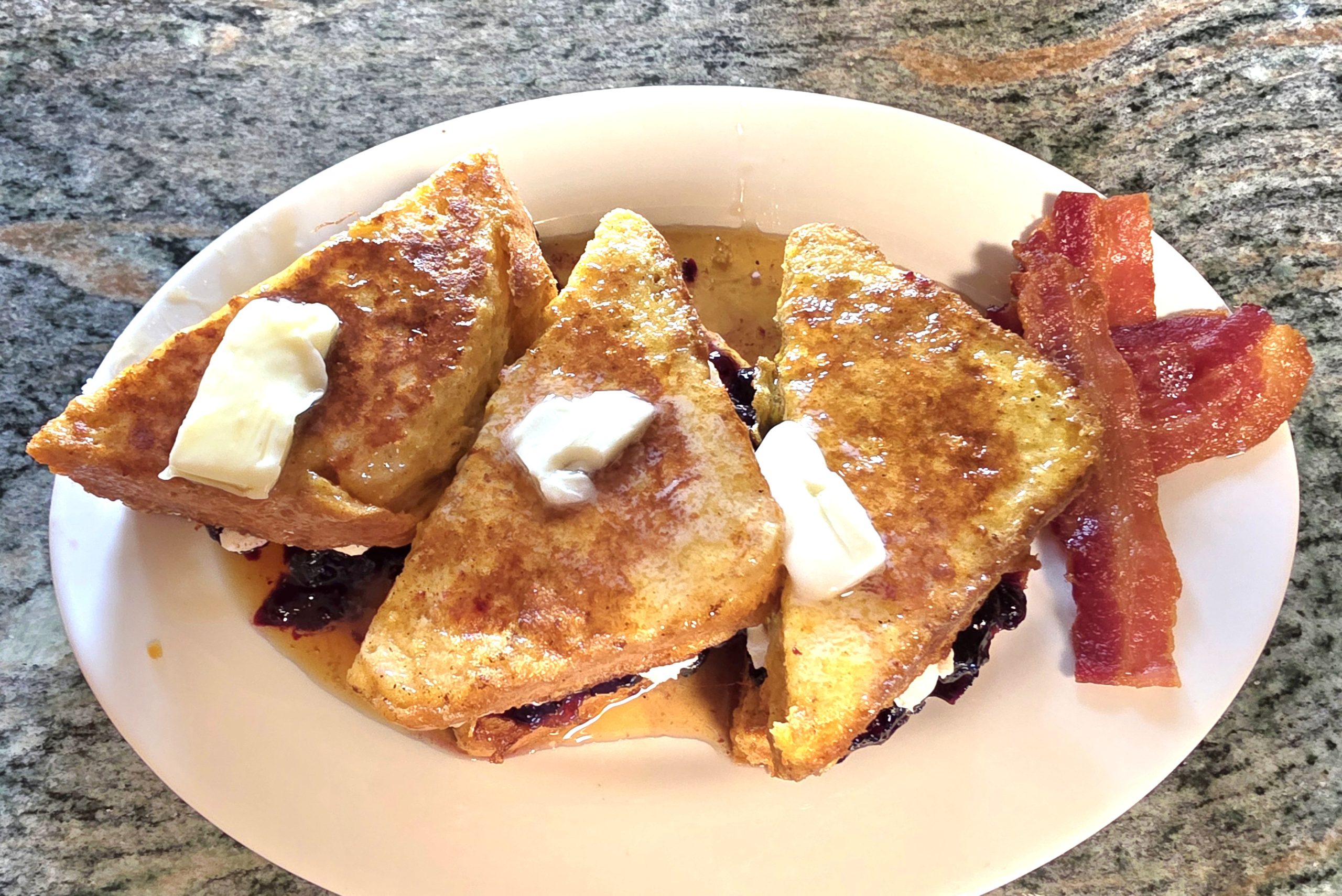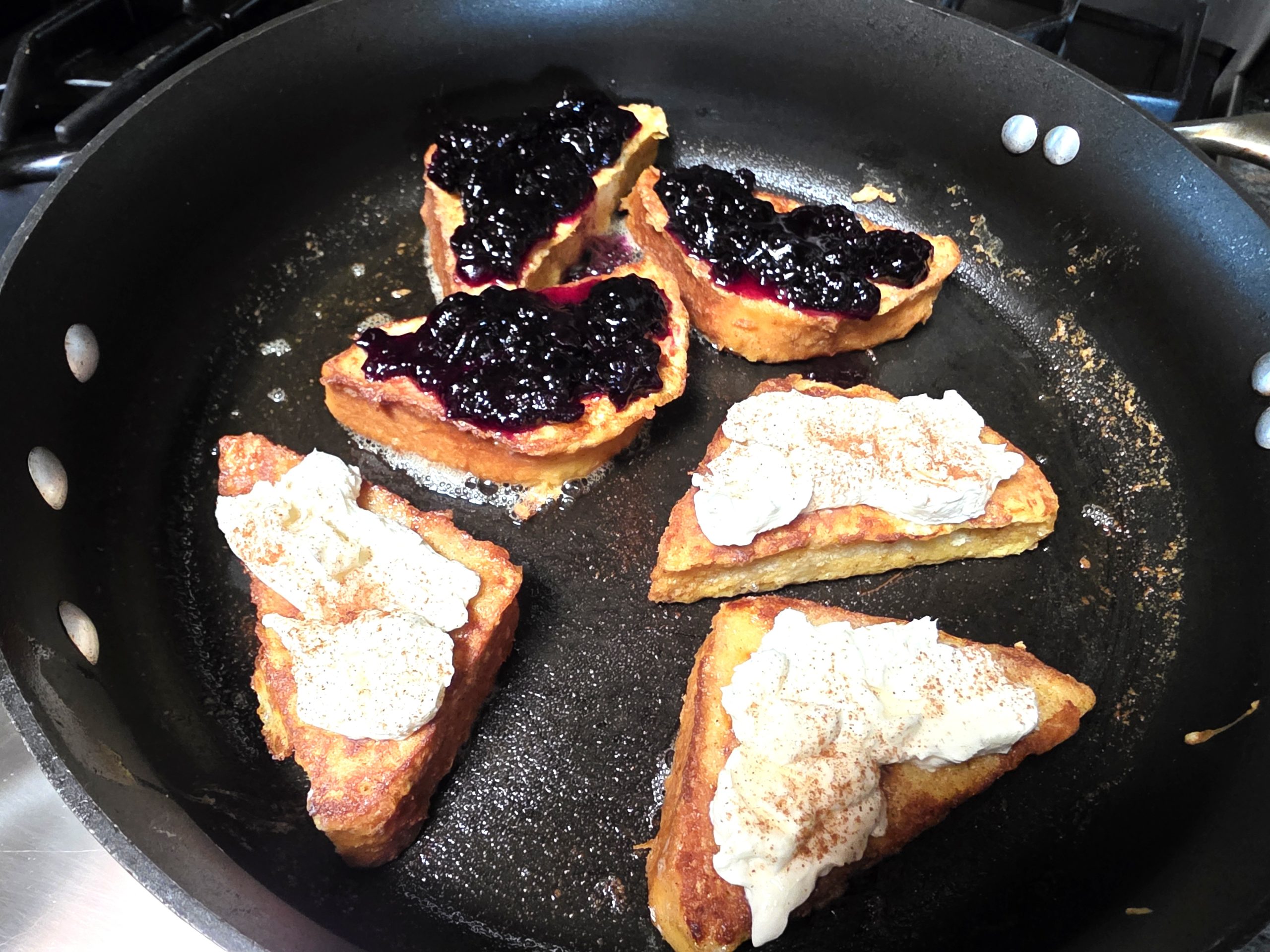 Get a heavy bottomed skillet very hot with 3 tablespoons of butter. Brown one side and then flip and add a generous amount of cream cheese on half of the portions and blueberry jam on the other portions. I sprinkled a little sugar and cinnamon on the cream cheese and then finished cooking. Serve with lots of maple syrup and fresh blueberries.