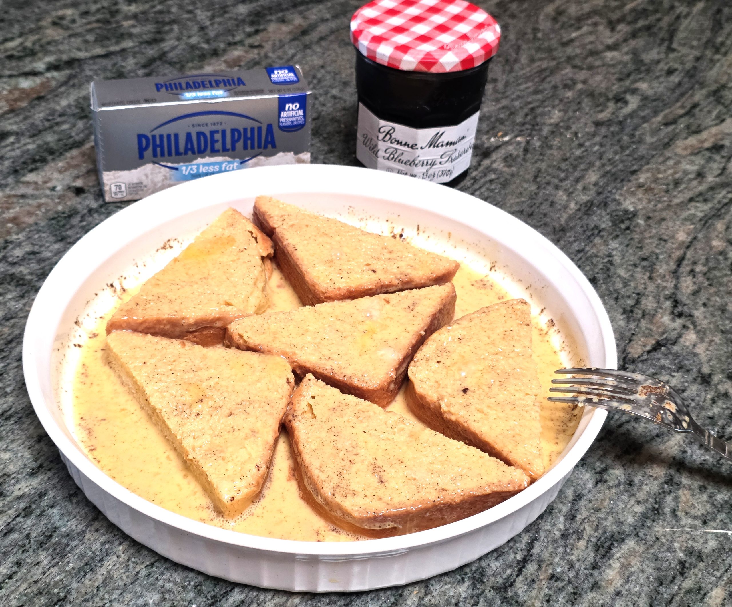 And now just a quick word about the Stuffed French Toast. I used blueberry preserves, but choose whatever jam is your favorite. Whisk about 3 eggs, 1/2 cup milk, 1/2 cup of half and half, pinch of salt, dash of cinnamon and a tablespoon of sugar. Let the bread slices soak for at least a minute on each side or until you see that the egg bath had saturated the slices.