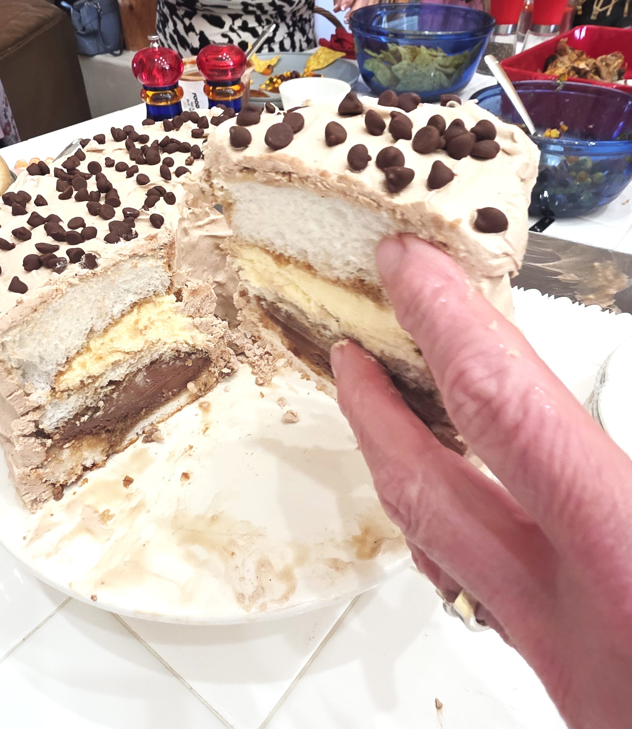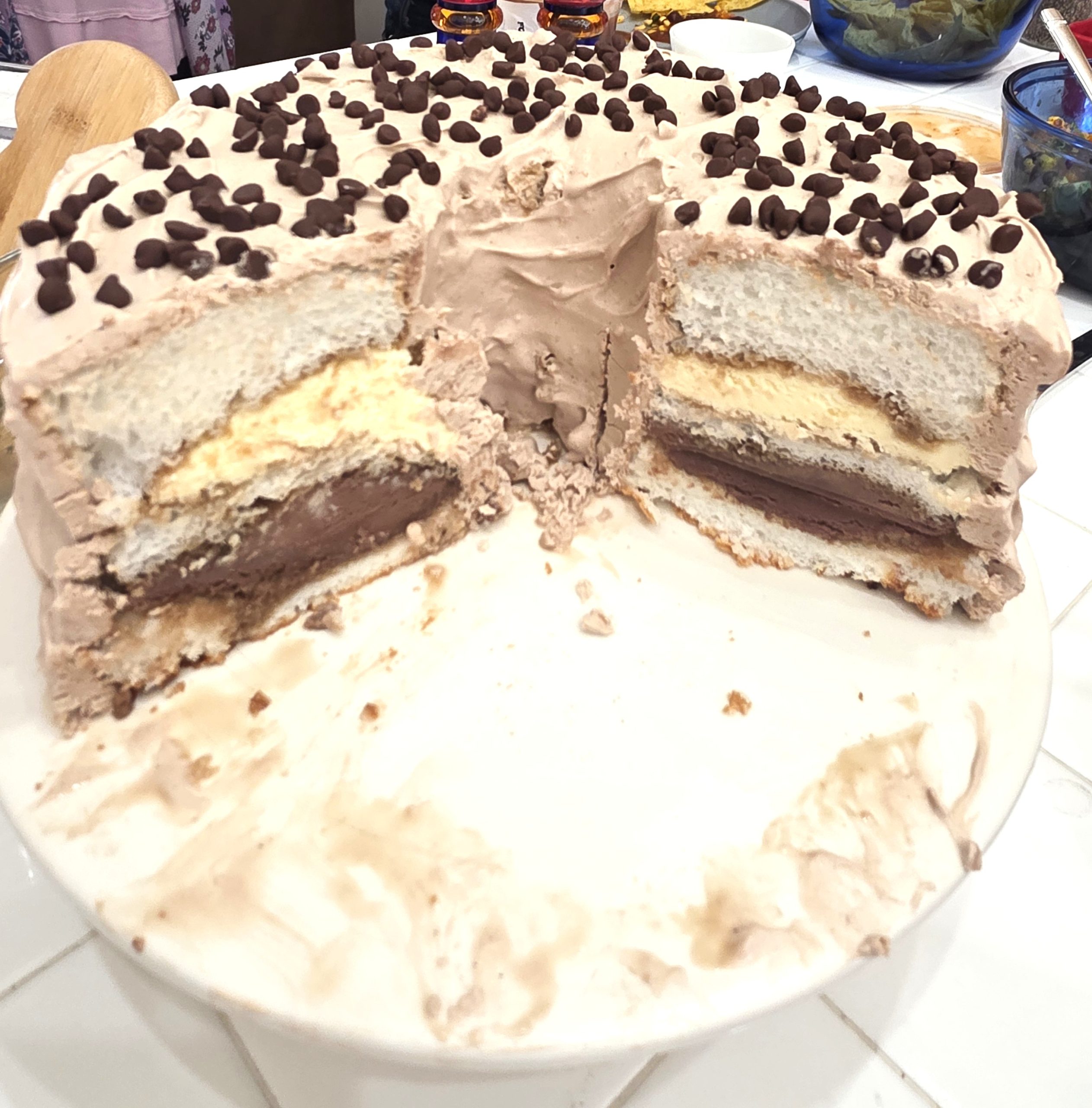 - Cover with mini-chocolate chips and place in the freezer for about an hour. Once the whipped cream is set, cover the cake with plastic wrap and freeze overnight.