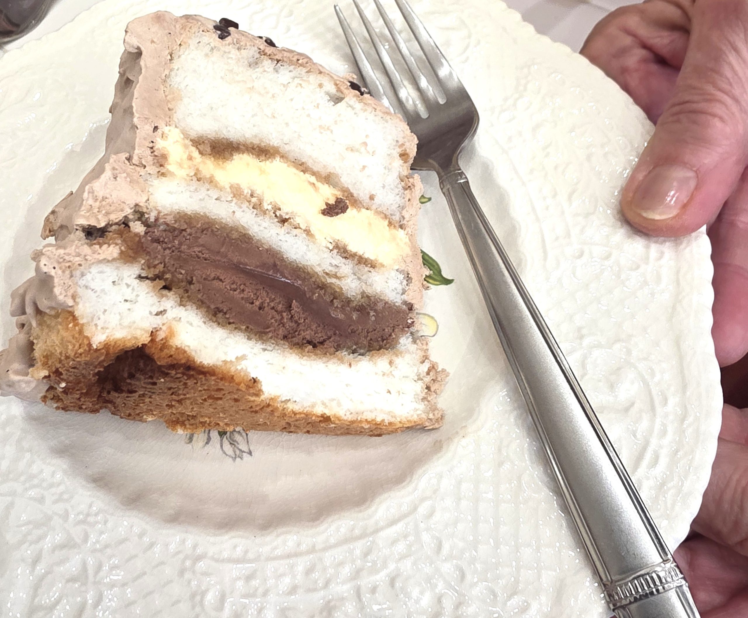 Growing up in New England we didn’t have a choice. It had to be Angel Food cake for your birthday. I made this cake for our monthly celebration of birthdays at our weekly Canasta game. This time two ladies, Kathi Gordon and Dianna Piles, were celebrating in the same month. One likes chocolate, the other vanilla so I had to do something to combine the two flavors. Also Kathi is from New England so we had to use Angel Food as the base of this birthday cake.