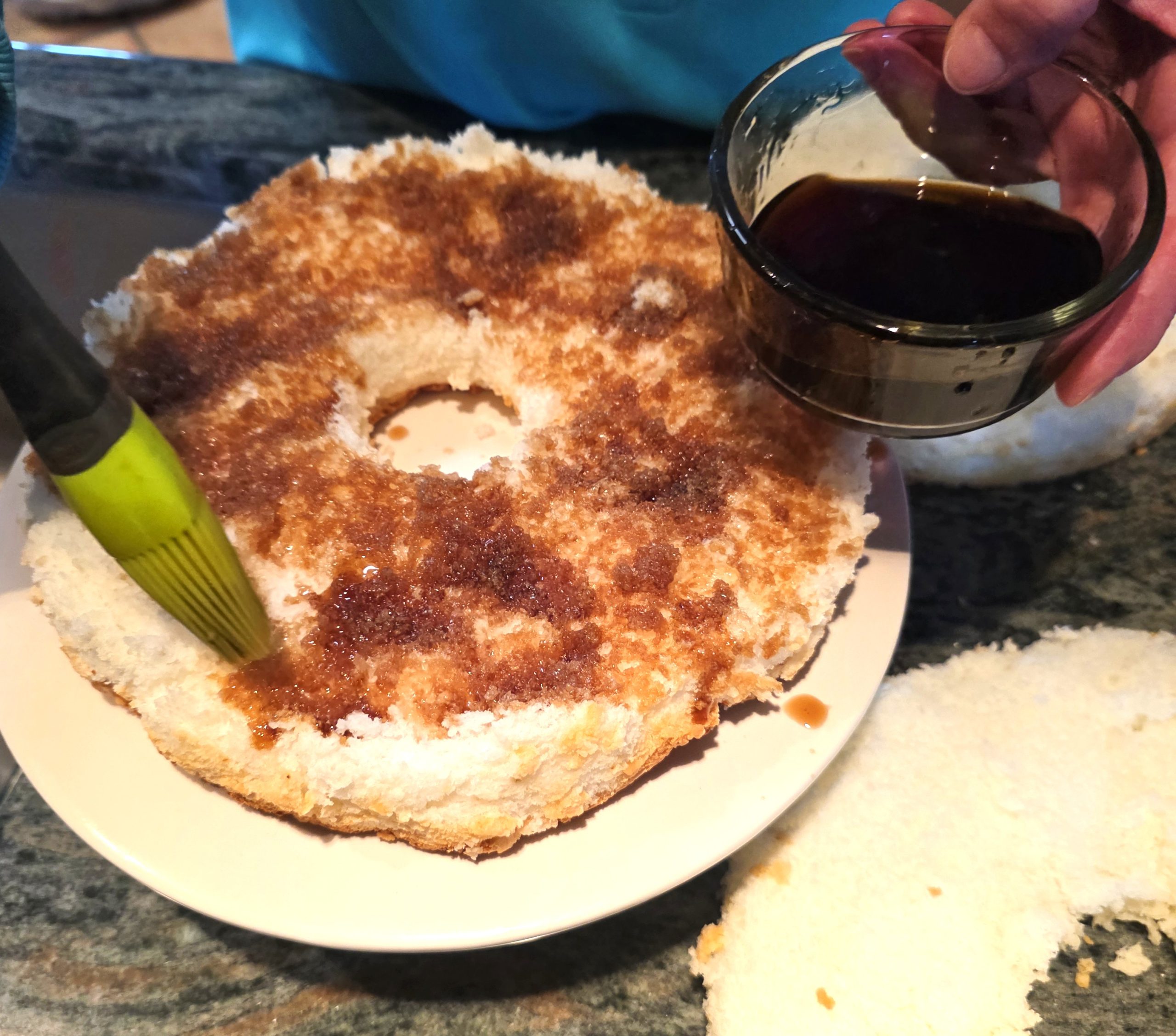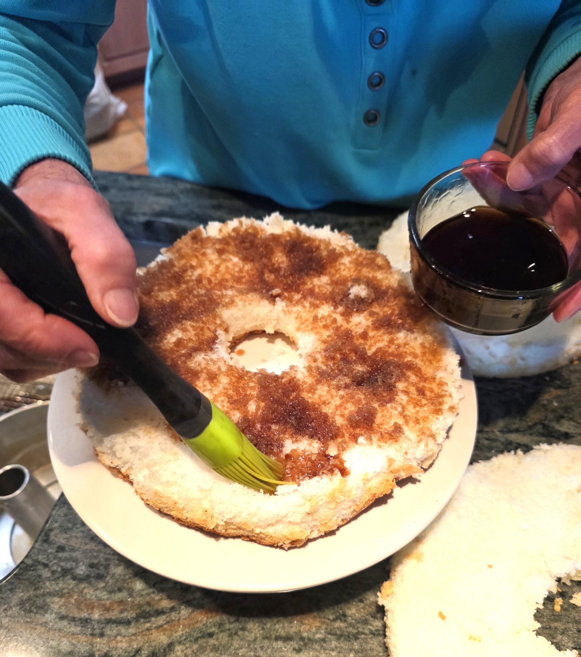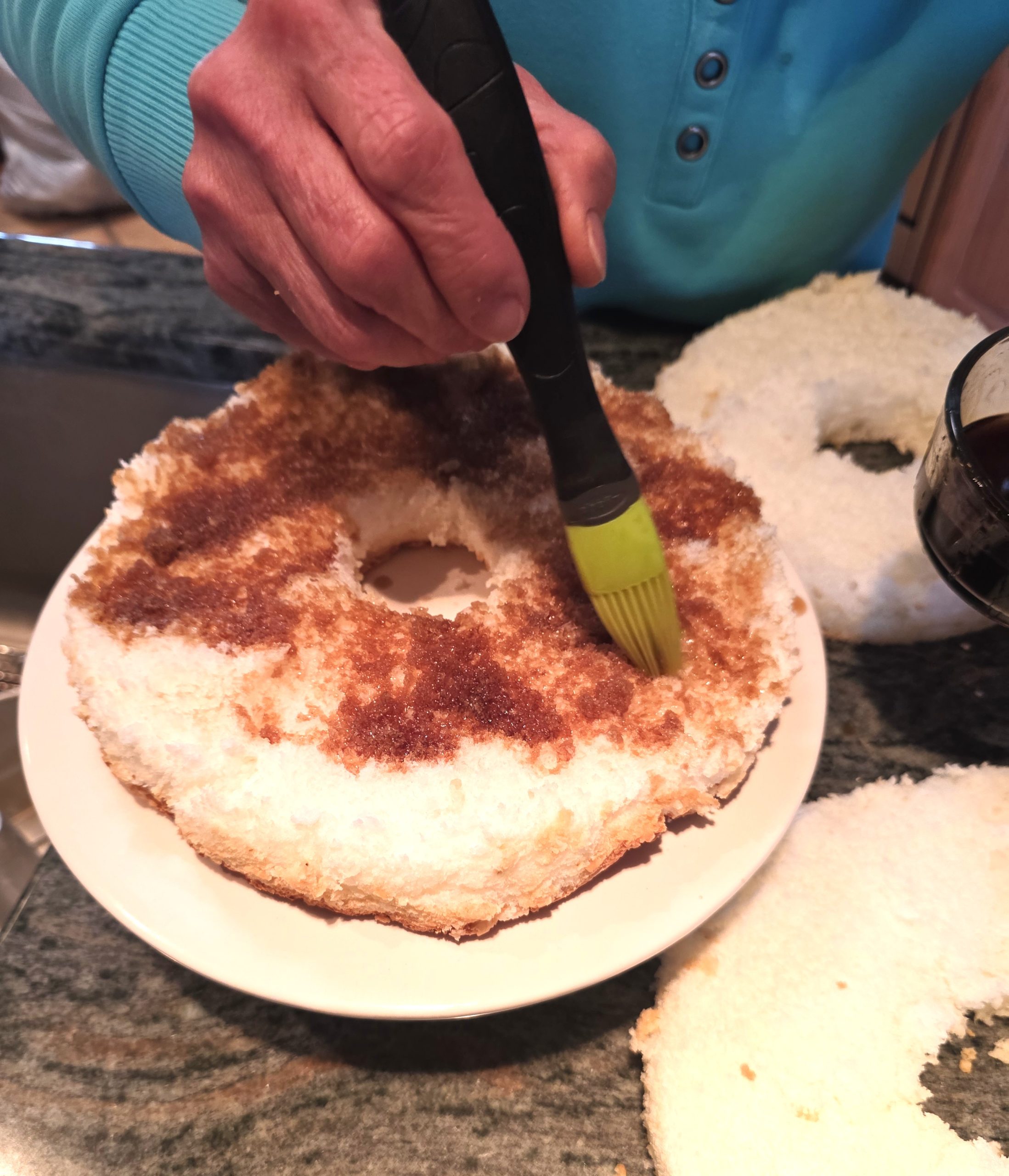 I didn’t measure the amount of Kahlua, but poured about a cup in a small bowl and just kept brushing it on until the layer was evenly covered.